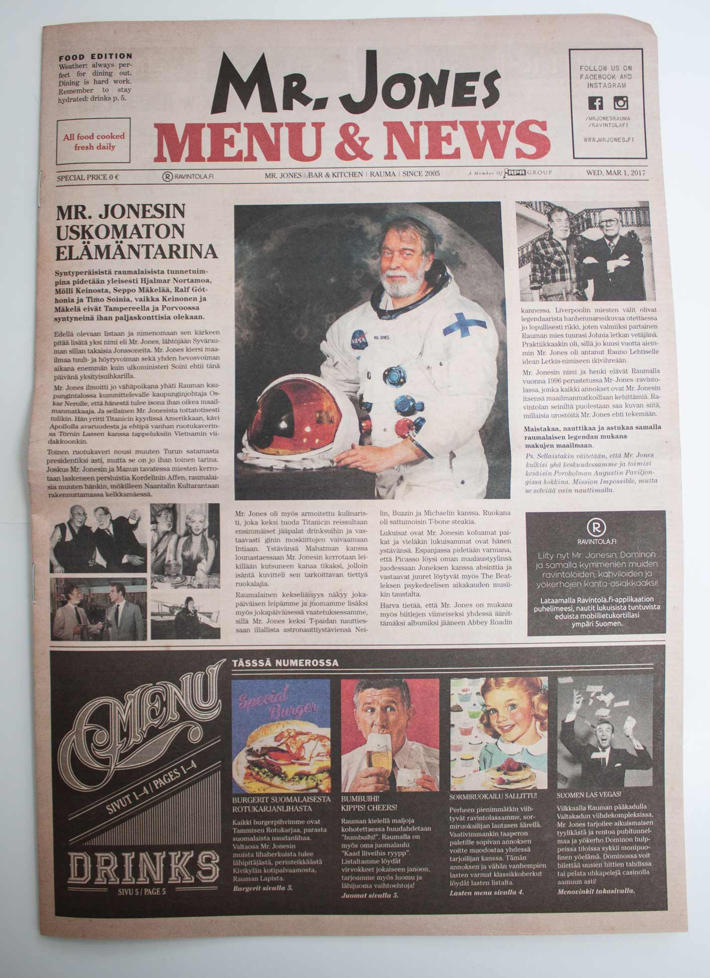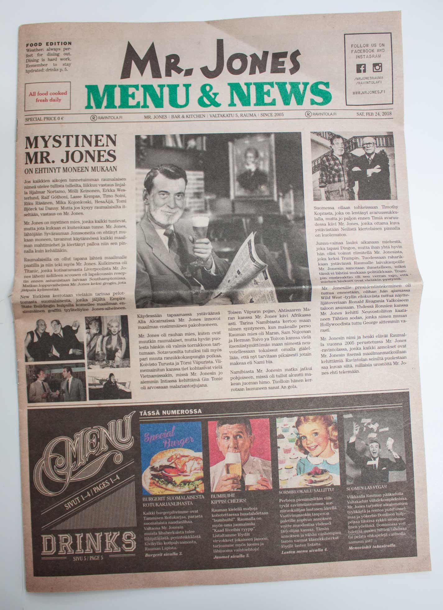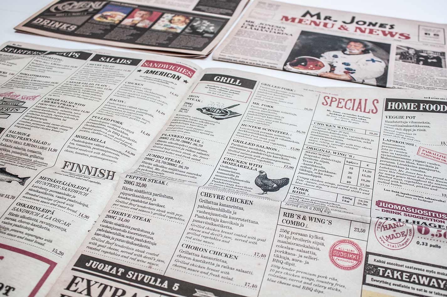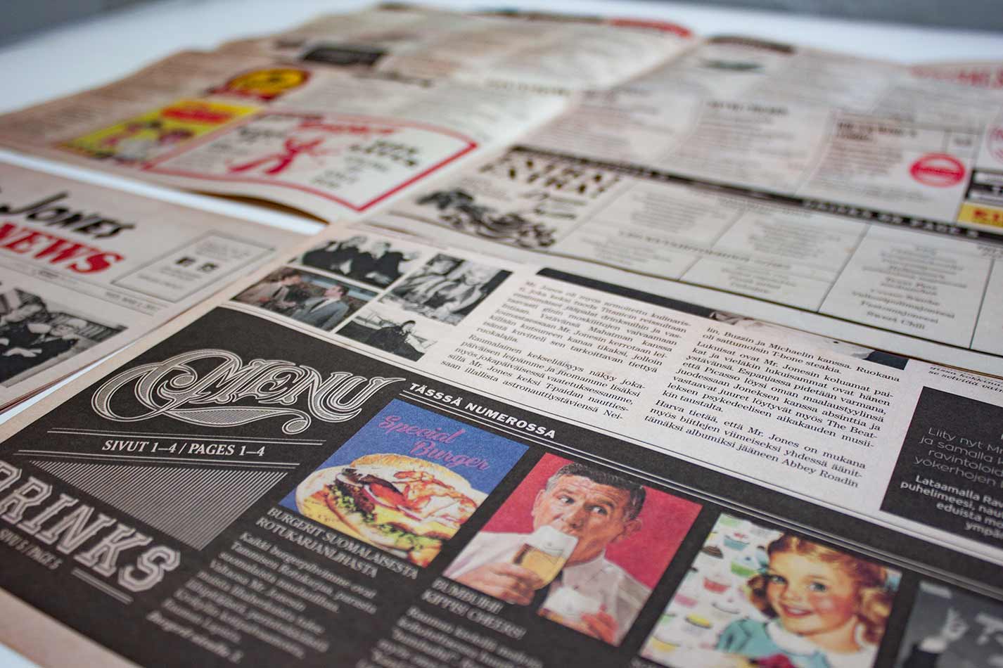 Monisivuinen ruokalista sanomalehtipaperille, visuaalinen ilme, taitto ja kuvitus. 4. painosta.