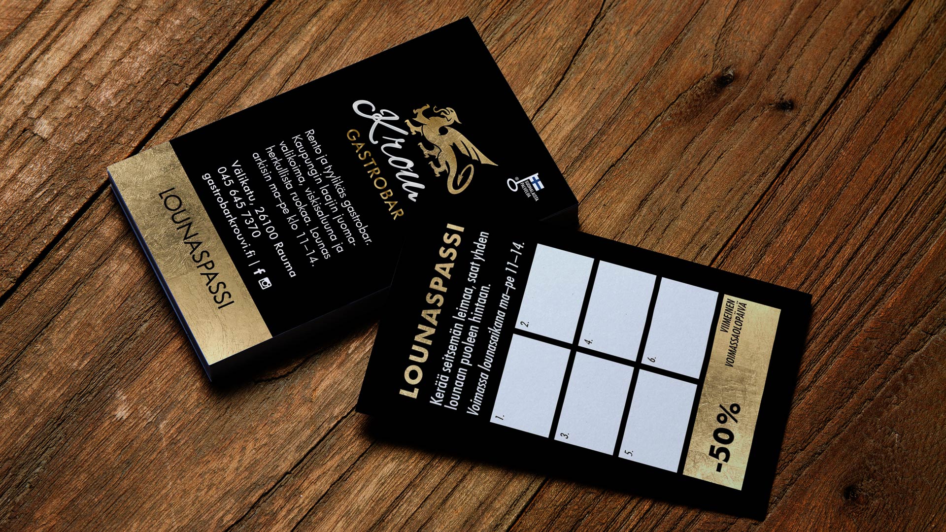 Logot, esitteet, ruokalistasuunnittelu, rollup, lehtimainoksia, lahjakortti, ikkunateippaukset, opasteita, pakkaussuunnittelu ja verkkosivustot.